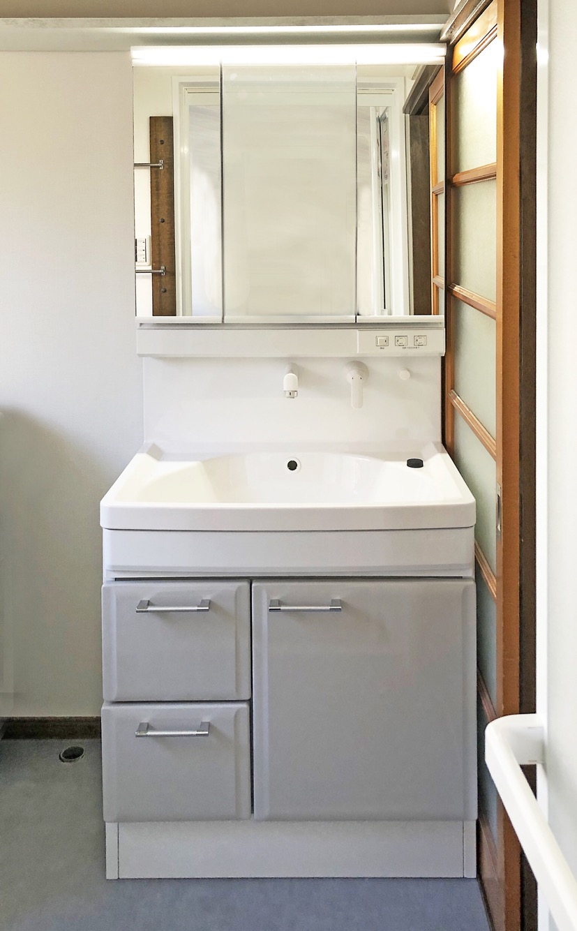 洗面化粧台を交換。さらに壁のクロス、床のクッションフロアの張り替えも行いました。脱衣所を丸ごとリフォーム!明るくなりました!