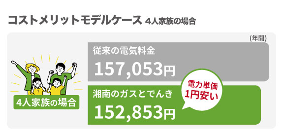 ※上記モデルケースは東京電力エナジーパートナー(株)従量電灯B料金単価を従来の電気料金として再生可能エネルギー発電促進賦課金および燃料費調整単価を含めずに湘南電力が独自に算出したものであり実際のコストメリットを保証するものではございません。※試算条件 契約種別:従量電灯B、契約容量:40A、使用量:350kWh/月(4,200kWh/年間)と仮定した算出。